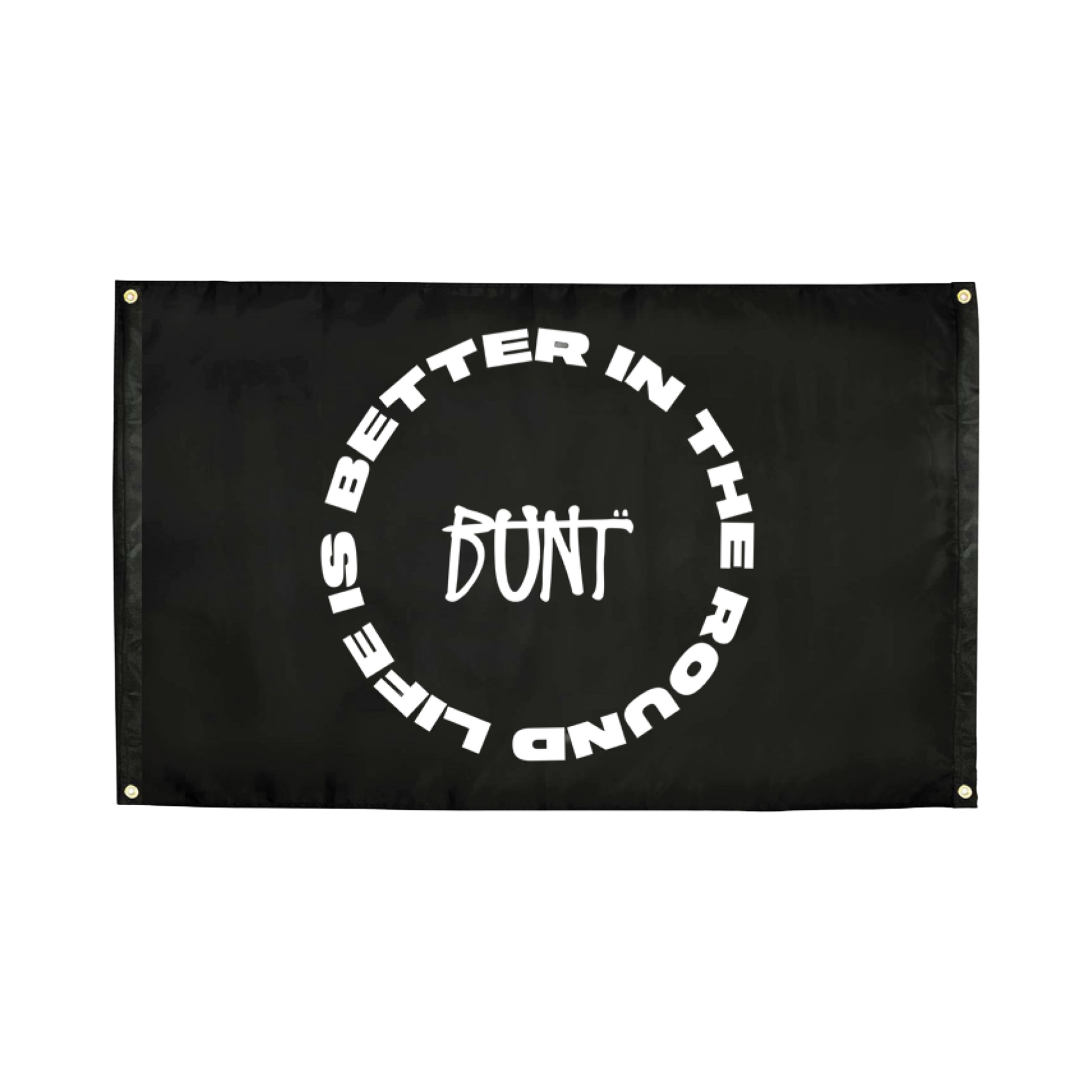 Wall Flag featuring blurred BUNT. logo on one side, and 'Better In The Round' graphic on the other.