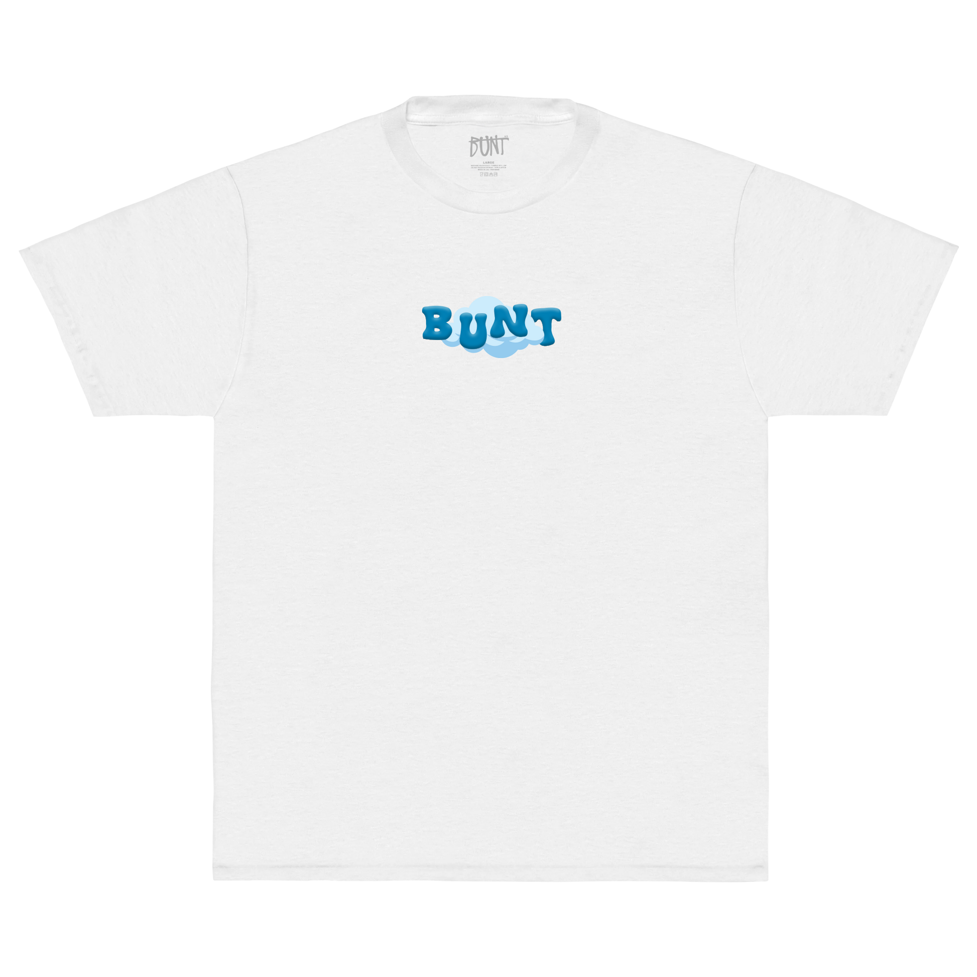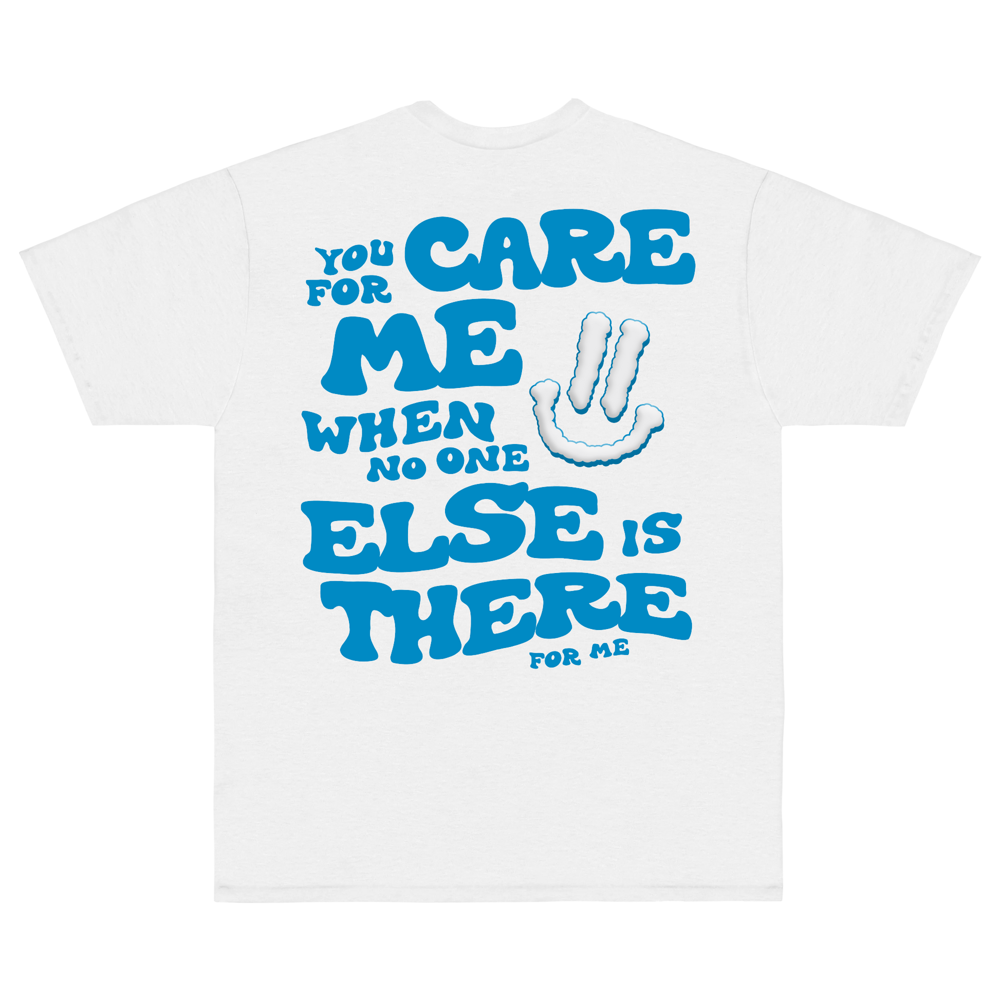 BUNT logo puff printed on the front and puff print 'You Care For Me When No One Else Is There For Me' graphic printed in blue on the back of a white, unisex tee.